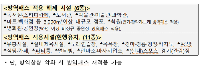 ▲ 방역패스 적용해제 6종 시설과 방역패스 적용 11종 시설. [중앙재난안전대책본부 제공] |
