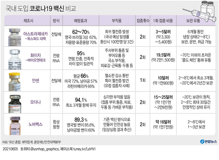 ▲ 국내 도입 코로나19 백신 비교. [그래픽=연합뉴스] |