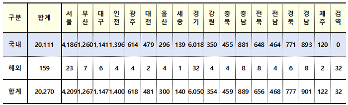 지역별로는 경기가 6018명으로 가장 많고, 이어 서울이 4186명이다. 인천(1396명)·부산(1260명)·대구(1141명)의 3개 시도는 1천명대를 기록했다. 이어 경남(893명)과 충남(881명)은 800명대, 경북(771명)은 700명대, 전북(648명)과 광주(614명)은 600명대다.