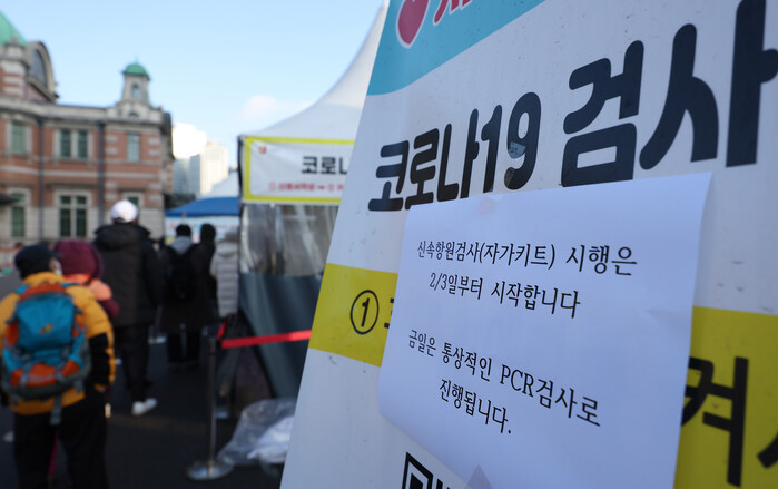 ▲ 설 연휴 마지막 날인 2일 오전 서울역광장에 마련된 코로나19 임시 선별검사소에 신속항원검사 관련 안내문이 붙어있다. 정부는 오미크론 변이 유행으로 확진자가 폭증하는 상황에 대비해 3일부터 60대 이상, 밀접접촉자 등 감염 고위험군은 PCR(유전자증폭) 검사를 하고, 그 외에는 신속항원검사 양성 시 PCR를 하도록 검사 체계를 바꾼다. [사진=연합뉴스] |