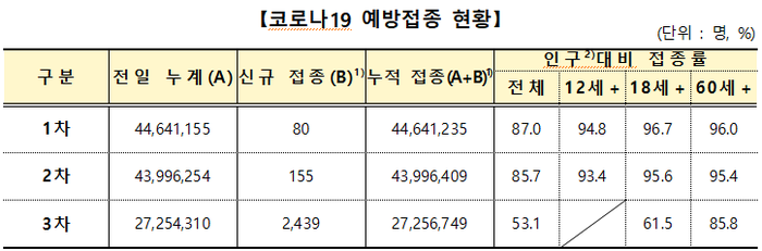 코로나19 백신 접종 완료율(2차까지 기본접종을 마친 비율)은 이날 0시 기준 85.7%(누적 4399만6409명)다. 12세 이상은 93.4%, 18세 이상은 95.6%, 60세 이상은 95.4%이다.
