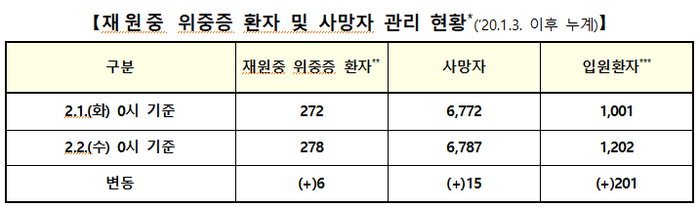 위중증환자 278명...사망자 15명·누적 치명률 0.77%