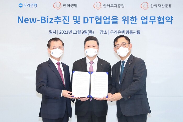 우리은행이 한화금융 3사와 손잡고 디지털협업과 함께 신사업을 공동추진한다. 협약과 함께 각 사는 공동으로 디지털 신사업 추진을 비롯해, 다자간 서비스 활성화를 위한 공동 마케팅과 증권 제휴서비스, 공동 상품 개발 및 투자 등 다양한 분야에서 적극 협력해 나가기로 했다.