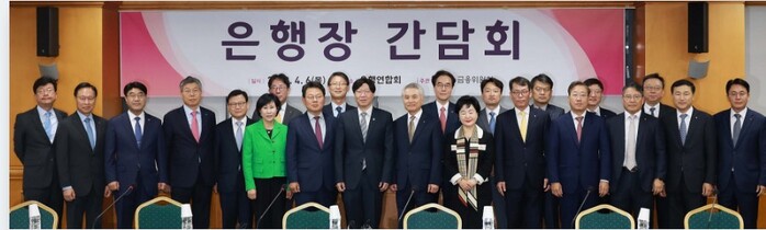 ▲은행연합회가 내달 23일 정기이사회를 열고 회장후보추천위원회 구성을 논의하는 등 오는 11월로 임기를 마치는 김광수 회장의 후임 인선 작업을 본격화한다. 지난 4월6일 은행회관에서 열린 은행장 간담회에서 김소영 금융위원회 부위원장과 20여개 은행장들, 은행연합회장이 기념사진을 촬영하고 있다. [사진=금융위원회] |