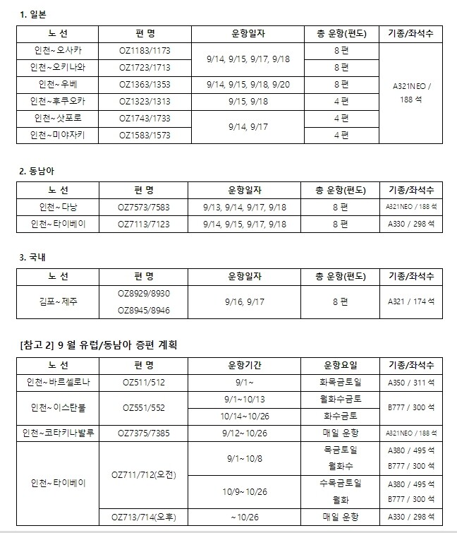 아시아나항공은 추석 연휴 기간인 9월 14일부터 18일까지 인천 출발 기준 ▲오사카 8편 ▲오키나와 8편 ▲우베 8편 ▲후쿠오카 4편 ▲삿포로 4편 ▲미야자키 4편 ▲다낭 8편 ▲타이베이 8편 등 국제선 8개 노선 52편(편도 기준)의 부정기편을 추가로 운항한다.