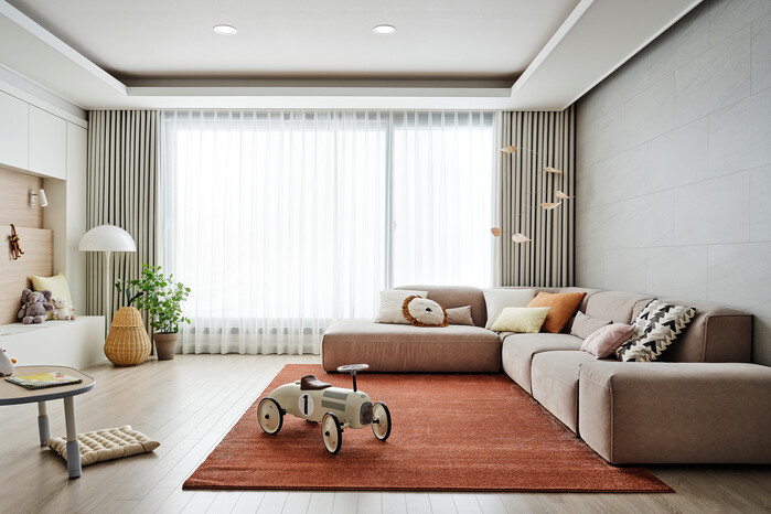 ▲ 한샘 패브릭으로 꾸민 거실 모습. 지오(화이트) 속커튼, 타코마(화이트) 생활암막커튼, 루나(브릭오렌지) 러그 사용. [사진=한샘 제공] |