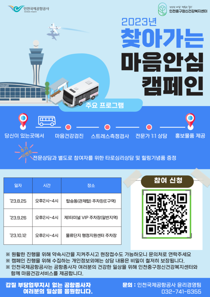 인천국제공항공사는 지난해 공항 상주직원을 대상으로 한 윤리인권상담소인 ‘마음여행 상담센터’를 운영한 바 있으며, 이 과정에서 상주직원들의 직무 스트레스와 대인관계 어려움에 대한 지원 필요성을 인식해 이번 마음상담 캠페인을 진행하게 됐다.