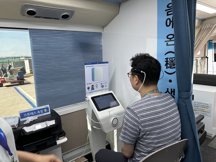 ▲지난 25일 인천공항 탑승동 현장에서 진행된 ‘2023년 찾아가는 마음안심 캠페인’ 1차 프로그램에서 공항 상주직원이 전문기기를 이용한 스트레스 진단을 하고 있다. |