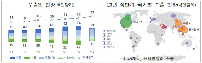 특히 올해 상반기는 지난해까지 3회뿐이었던 ‘월간 수출량 3000톤 이상 기록한 달’이 지금까지 4회에 이르는 것으로 나타났다. 수출액 기준으로 살펴보면, 미국(비중 31.6%), 중국(12.2%), 필리핀(10.3%) 등 49개국이 반기 최다 수출을 기록했다.