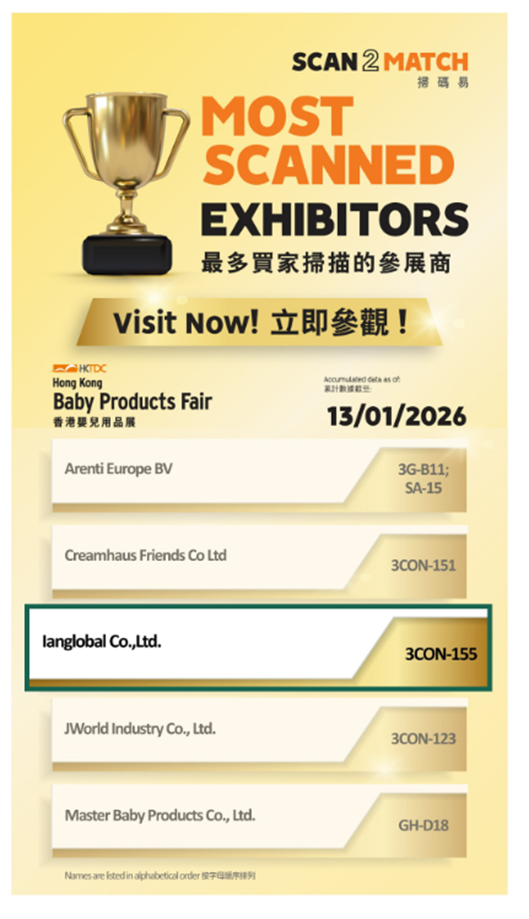 이번 홍콩 Baby Products Fair는 전 세계 바이어들이 참여하는 글로벌 유아·베이비 산업 박람회로, 현장에서는 QR 기반 바이어 매칭 시스템을 통해 관심 브랜드를 스캔하는 방식으로 참가사에 대한 관심도가 집계됐다. 주다안은 박람회 기간 동안 다수의 바이어 스캔을 기록하며 상위 3개 브랜드에 이름을 올렸다.