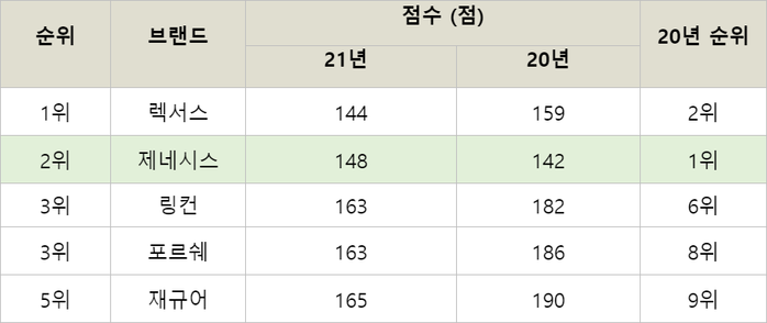 지난해까지 같은 조사에서 5년 연속 1위를 지켜오던 제네시스는 올해 렉서스에게 1위를 내주고 2위로 내려왔다.
