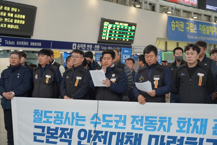 | ▲철도노조가 수도권 전동차의 안전대책 수립을 촉구하며 지난 19일 서울역에서 긴급 기자회견을 열었다. |