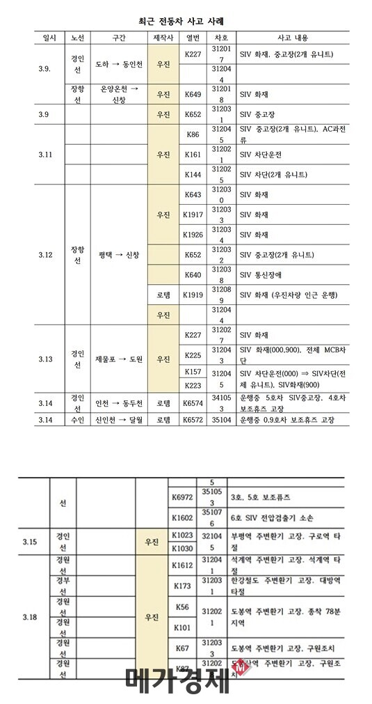 | ▲최근 전동차 사고 사례- 우진산전과 현대로템이 납품한 챠량들의 사고내용 기록[사진 자료=전국철도노동조합 제공] |