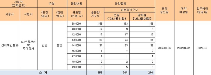 이 중 전용면적 ▲38㎡(153가구) ▲42㎡(17가구) ▲48㎡(2가구)는 전체 공급 가구 수가 미분양됐다. ▲43㎡(25가구) ▲44㎡(34가구) ▲49㎡(6가구)는 평형별 1가구씩만 분양됐을 뿐이다.