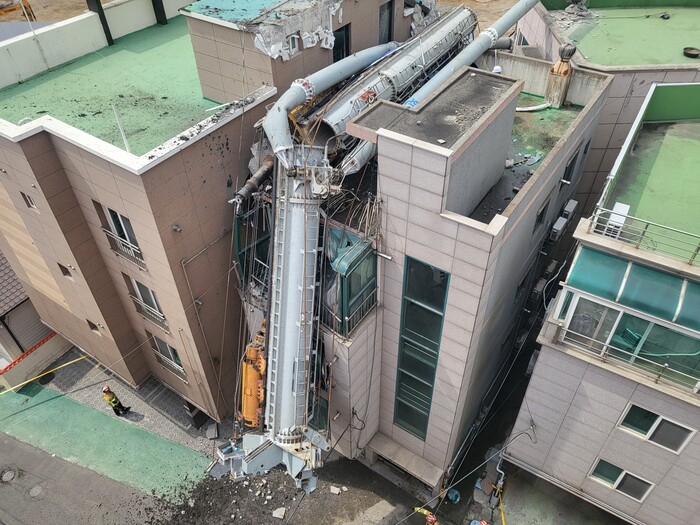 | ▲ 3월 29일 오전 울산시 남구의 신세계건설 아파트 공사 현장에서 넘어진 천공 중장비가 인근 원룸 건물을 덮친 사고 현장 [사진=연합뉴스] |