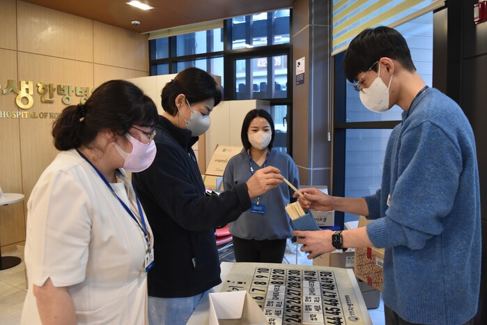 ▲ 인천자생한방병원 ‘설 맞이 행사’에 참여한 환자와 의료진이 뽑기 게임을 하고 있다. [사진=자생한방병원 제공] |
