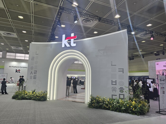 KT는 이번 전시에서 ‘한글’을 전면에 내세운 한국형 콘셉트 공간으로 관람객의 시선을 끌었다. 전시관 입구부터 한글 자모를 모티브로 한 구조물이 배치되며, ‘연결’을 의미하는 브랜드 메시지를 풀어냈다.