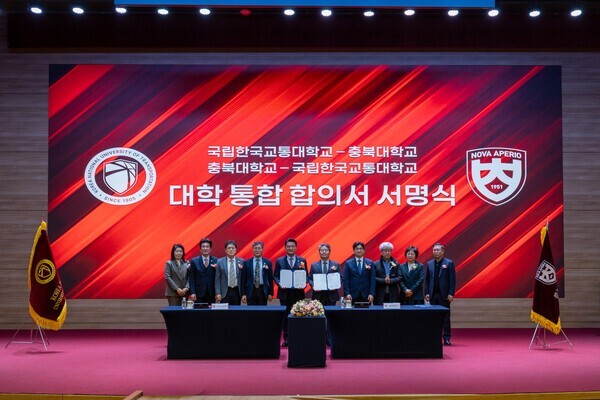 ▲ 국립한국교통대-충북대 ‘대학 통합 합의서’ 서명식 개최 모습 [사진=국립한국교통대학교]
