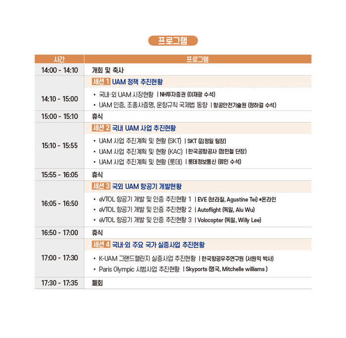 올해는 ‘UAM 실증사업 및 시범사업의 동향’을 주제로 ‘K-UAM 그랜드 챌린지’에 참여한 국내기업과 기체 개발 업체 등 해외기업, 그리고 2024 파리 올림픽에서 UAM 시범사업을 준비하는 해외 기관 등이 다수 참여해 발표할 예정이다.