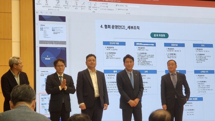 ▲ 사단법인 한국-우크라이나 뉴빌딩협회 신임임원진들이 단상에서 포부를 밝히고 있다.[사진= [사진= 한국·우크라이나 뉴빌딩 협회 설립추진단] |