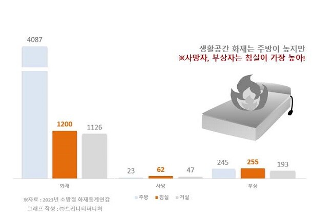 [메가경제=양대선 기자] 소방청 통계에 따르면 실주거지 내 화재가 가장 많이 발생하는 곳은 주방이나 사망자와 부상자는 침실에서 가장 많다. 침실의 경우 가구와 침대, 침구 등 불에 잘 타는 가연재가 많기 때문이다.