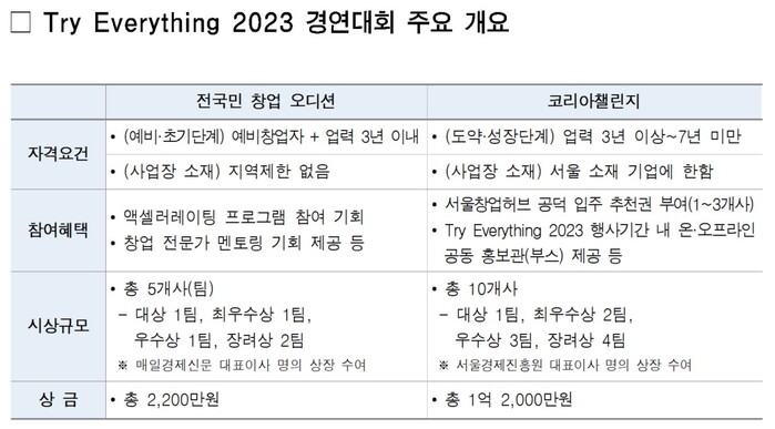 글로벌 스타트업 축제 Try Everything의 대표경연대회는 ‘전국민 창업 오디션’과 ‘코리아챌린지’이다. ‘전국민 창업 오디션’은 혁신 아이디어를 보유한 예비창업자와 3년 미만 스타트업이 도전할 수 있고, ‘코리아챌린지’는 글로벌 진출을 희망하는 3년 이상 7년 미만 스타트업이 도전할 수 있다.
