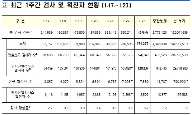 이날 발표된 확진자 수는 의심신고 검사자 중 5228명(67.2%), 임시선별검사소 검사자 중 2502명(32.8%)명이 나왔다.