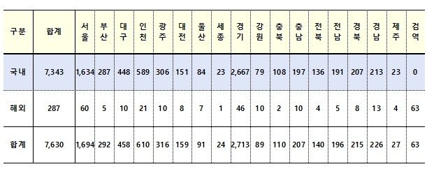 신규 확진자 7630명의 감염경로를 보면 국내 지역발생은 7343명이었고 해외유입은 287명이었다. 전날보다 지역발생은 615명, 해외유입은 7명이 각각 많다.