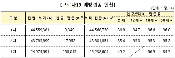 이 중 3차 접종은 전체 인구의 49.2%(누적 2523만2604명)가 마쳤다. 이중 18세 이상은 56.9%, 60세 이상은 84.7%에 달했다.