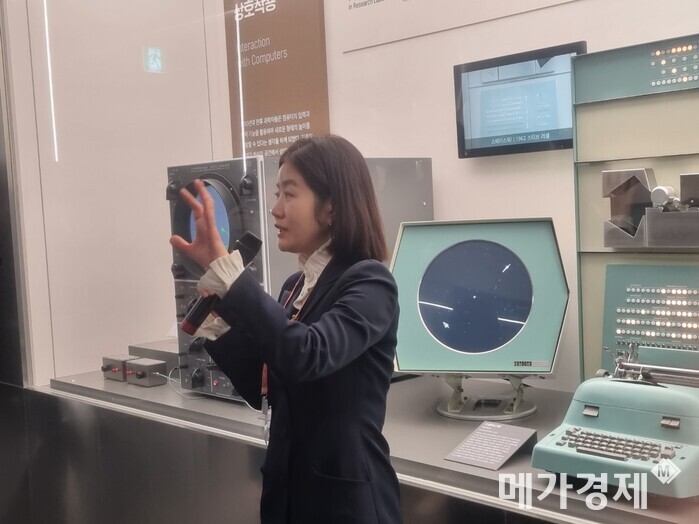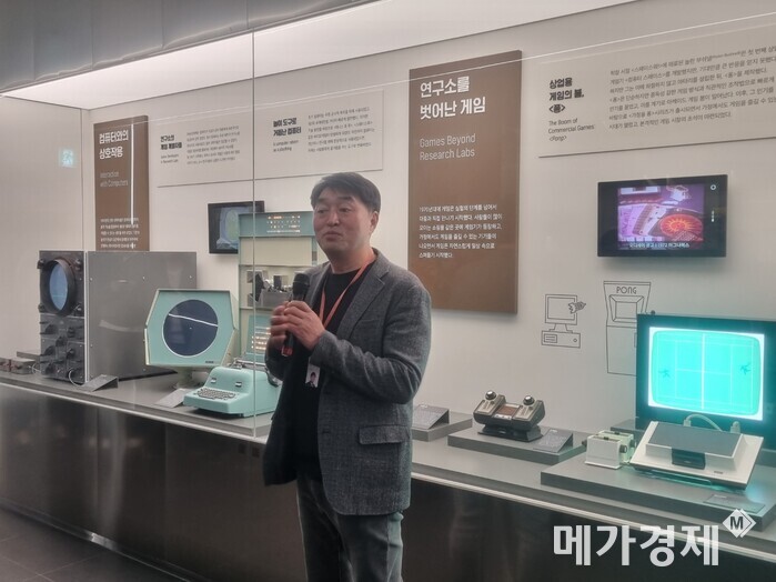 이날 도슨트를 맡은 조지영 팀장은 "대학과 연구실에서 취미의 영역으로 제작하던 게임이 MIT 공대를 통해 오픈소스가 공유되며 '스페이스 워' 등 최초의 비디오게임이 등장했다"며 "이후 스페이스 워는 스페이스 인베이더와 갤로그 등 게임의 영향을 줬다"고 말했다.