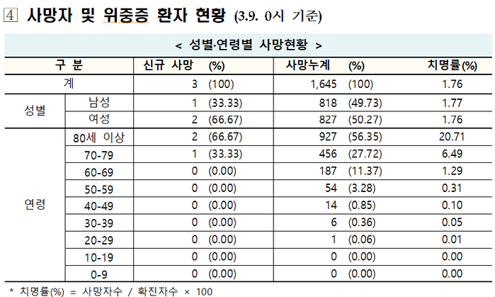 전날 3명이 더 목숨을 잃으면서 누적 사망자는 1645명으로 늘었다. 국내 평균 치명률은 1.76%를 보였다. 위중증 환자는 총 128명으로, 전날과 같았다.
