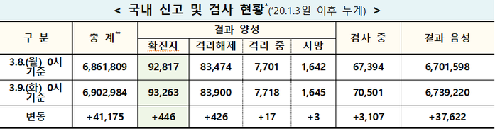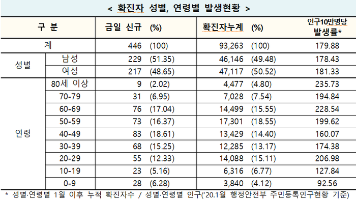 중앙방역대책본부(방대본)는 9일 0시 기준으로 코로나19 신규 확진자가 446명 발생해 누적 9만3263명(해외유입 7207명)으로 집계됐다고 밝혔다.