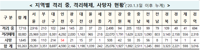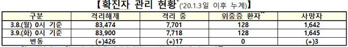 전날 하루 426명이 추가 완치돼 누적 격리해제자는 8만3900명이며, 격리치료 중인 환자는 17명 많아진 총 7718명이다.