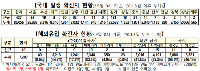 신규 확진자를 감염경로별로 보면 지역발생(국내발생)은 427명, 해외유입은 19명이다. 전날보다 지역발생은 92명이나 증가했고, 해외유입도 8명이 늘었다.