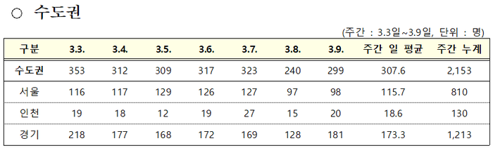 수도권 지역발생 확진자는 경기가 181명으로 가장 많았고, 이어 서울 98명, 인천 20명이다. 증가한 수도권 확진자는 대부분 경기 지역에서 나왔다. 전날보다 경기는 53명이 늘었고, 서울은 1명, 인천은 5명이 많았다.