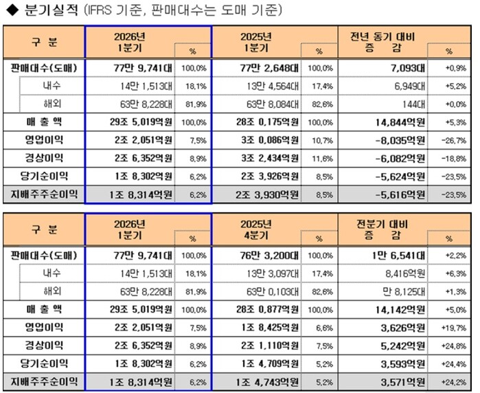 경영 실적을 보면 매출은 글로벌 판매 증가와 더불어 고부가가치 차량 중심의 믹스 개선, 우호적인 환율 효과에 따른 평균판매가 상승으로 전년 동기보다 5.3% 증가한 29조 5019억 원으로 집계됐다.
