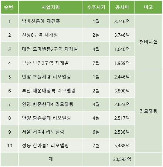 올해 들어서도 8월 말 기준 10개 사업지에서 3조 593억 원의 수주를 기록하며 현재까지 가장 많은 수주고를 올리고 있다. 리모델링 부문에서만 6개 사업지에서 1조 9502억 원의 수주고를 올렸고 정비사업으로는 ▲방배 신동아 재건축 ▲신당8구역 재개발 ▲대전 도마변동2구역 재개발 ▲부산 부민2구역 재개발 등 4개 사업지에서 1조 1091억 원을 수주했다.