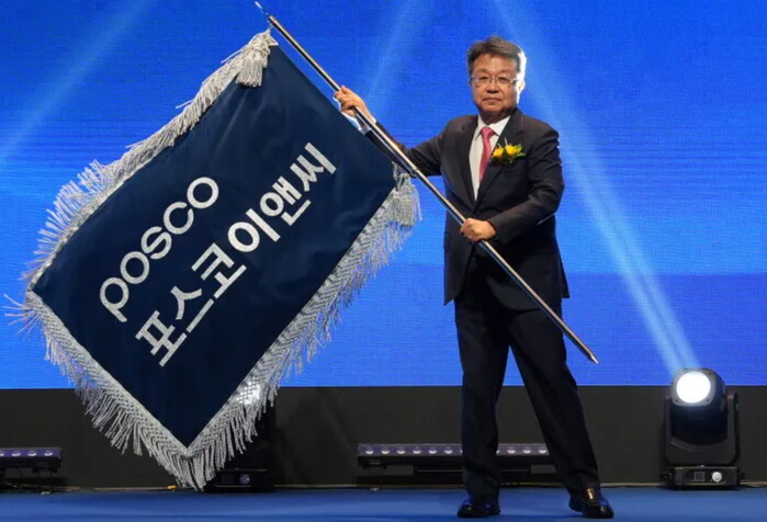 ▲ 한성희 포스코이앤씨 대표가 올해 3월 20일 사명이 변경된 깃발을 흔들고 있다. [사진=포스코이앤씨] |