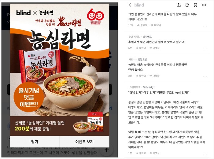 | ▲ 농심이 신제품 '농심라면' 댓글 이벤트를 블라인드 앱에서 진행했다. [사진=블라인드 캡쳐] |