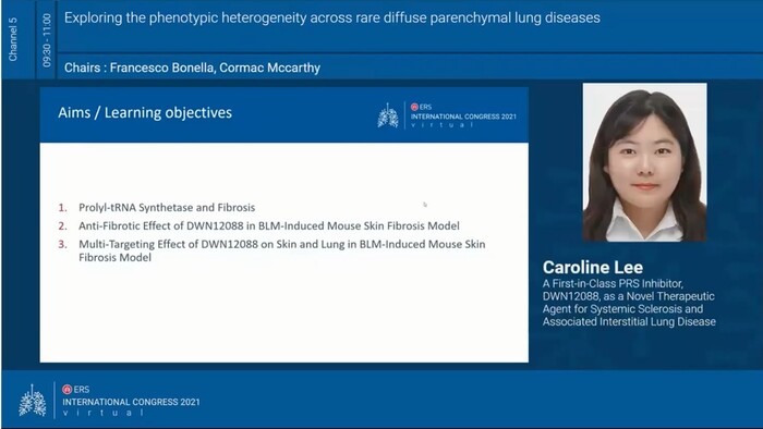 | ▲ 대웅제약이 5일부터 8일까지(현지 시간) 온라인으로 진행된 유럽호흡기학회(ERS, European Respiratory Society) 연례학술대회에서 섬유증 치료 후보 물질 ‘DWN12088’의 전신경화증 연관 간질성폐질환에 대한 비임상시험 결과를 발표했다. [대웅제약 제공] |