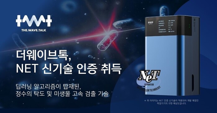 [메가경제=양대선 기자] AI 딥러닝 탁도, 미생물 센서 전문 기업인 더웨이브톡(대표 김영덕)은 자사 기술이 산업통상자원부 국가기술표준원으로부터 국가 신기술(NET) 인증을 취득했다고 12일 밝혔다.