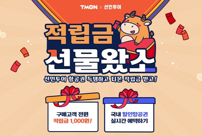 티몬은 이달 말일까지 자사의 실시간항공권 예약사이트에서 선민투어 상품(~3월31일까지의 출발일자)을 예약하는 고객에게 적립금 1000원을 지급하는 행사를 진행 중이다.