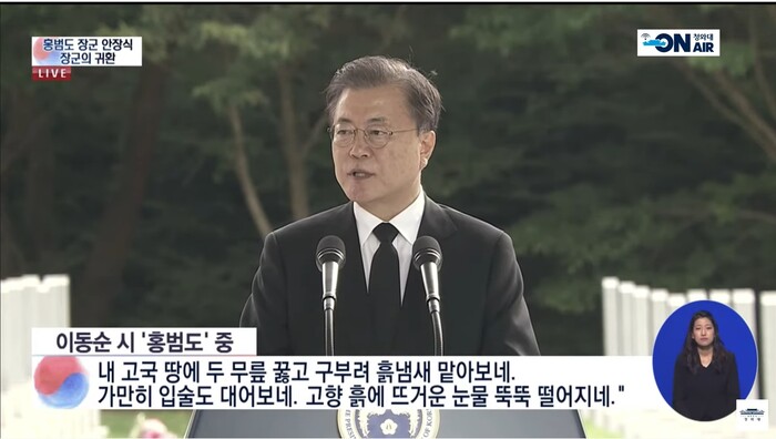 ▲ 문재인 대통령이 홈범도 장과 안장식에서 추모사를 하고 있다. [출처=청와대 유튜브 캡처] |