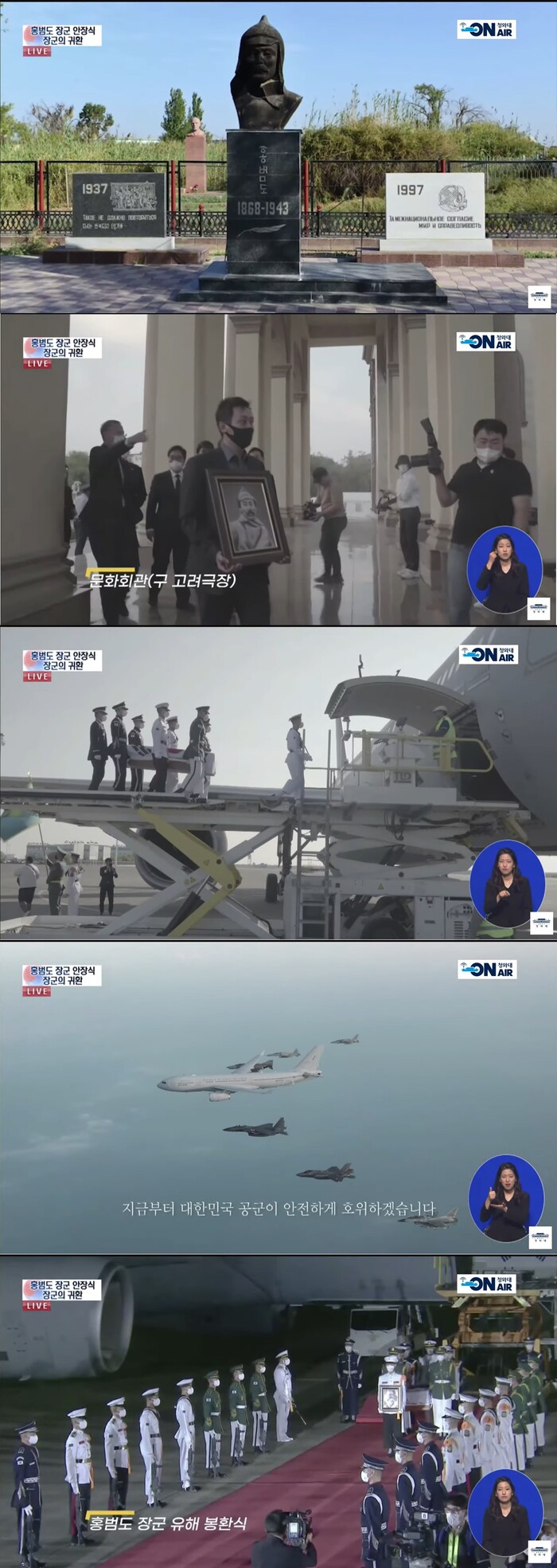 ▲ 홍범도 장군 카자흐스탄 묘역서 서울공항 귀환까지 여정. [출처=청와대 유튜브 캡처] |