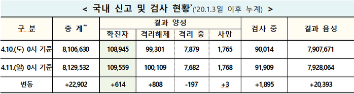 중앙방역대책본부(방대본)는 11일 0시 기준으로 전날 대비 신규 확진자는 614명이 발생해 누적 확진자는 10만9559명으로 집계됐다. 이 추세대로라면 12일 발표에는 11만명을 넘을 전망이다. 해외유입 확진자는 전날보다 20명이 추가돼 누적 7824명이 됐다.