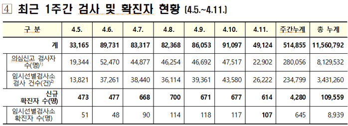 ▲ 최근 1주간 검사 및 확진자 현황. [출처= 중앙방역대채본부] |
