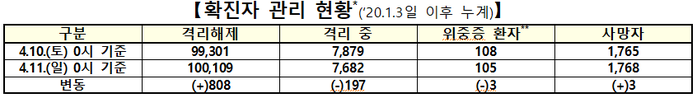 ▲ 11일 0시 기준 코로나19 확진자 관리 현황. [출처= 중앙방역대책본부] |