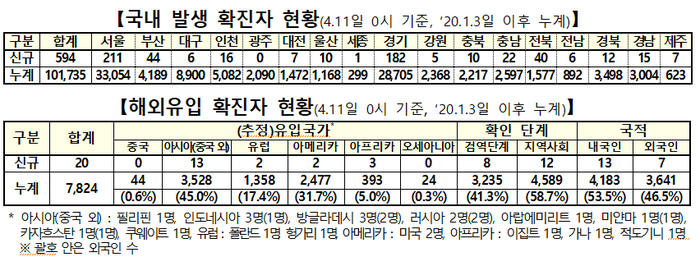 ▲ 11일 0시 기준 코로나19 국내발생 및 해외유입 확진자 현황. [출처= 중앙방역대책본부] |