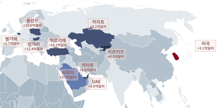 이에 따르면 2023년 1~9월 누적 수출액 기준으로 전년대비 수출이 가장 많이 증가한 상위 10대 국가로는 폴란드, 헝가리, 튀르키예, 키르기스스탄, 사우디아라비아, 카자흐스탄, 미국, UAE, 벨기에, 카타르 등이 꼽혔다.