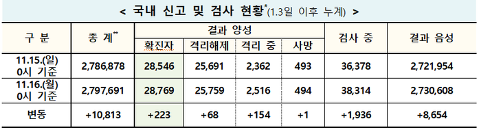 중앙방역대책본부(방대본)는 16일 0시 기준으로 전날 대비 코로나19 신규 확진자가 전날(208명)보다 15명이 늘어난 223명으로 집계됐다고 밝혔다. 이로써 지금까지 국내 누적 확진자는 총 2만8769명으로 증가했다.